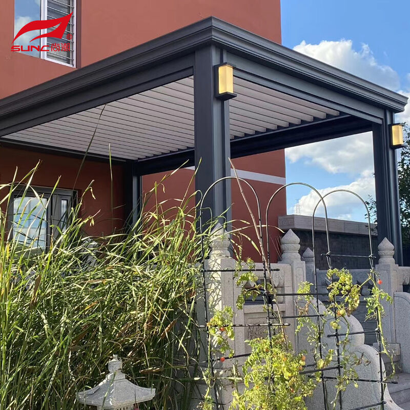 La pérgola de aluminio con techo con luzera ofrece más opciones de modelos, puede personalizar el estilo y el color de acuerdo con su propio lugar.el cobertizo eléctrico adopta el control automático de la azotea, puedes ajustar la persiana según el clima.